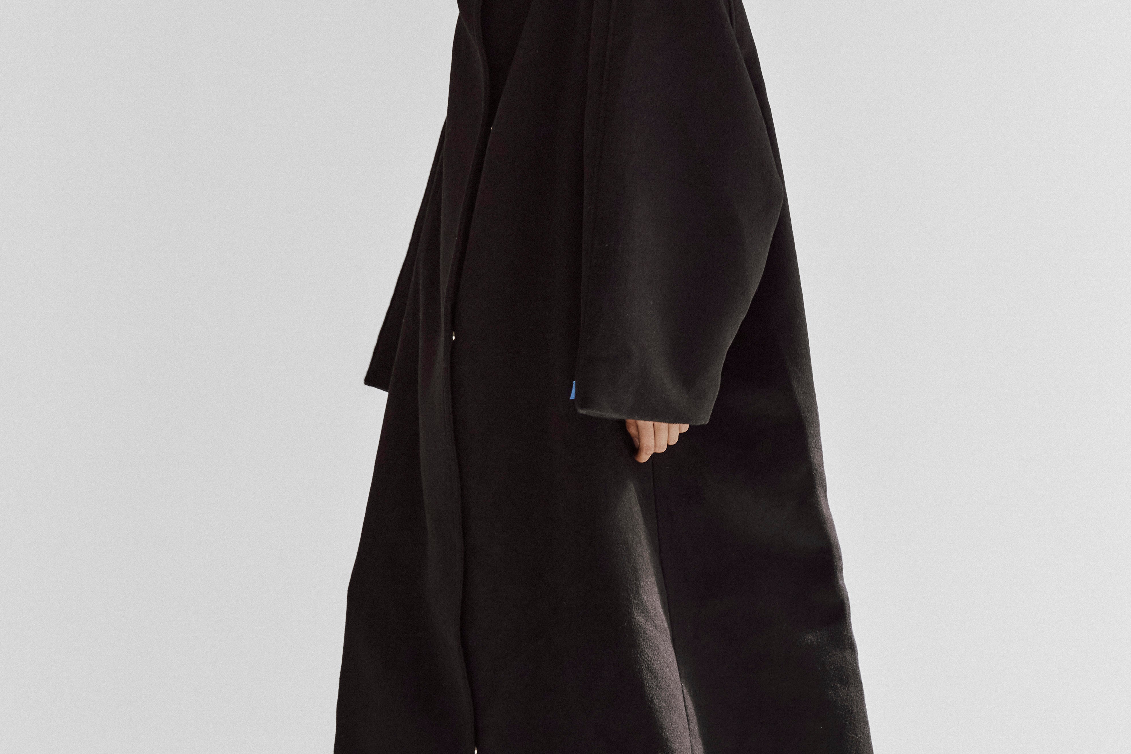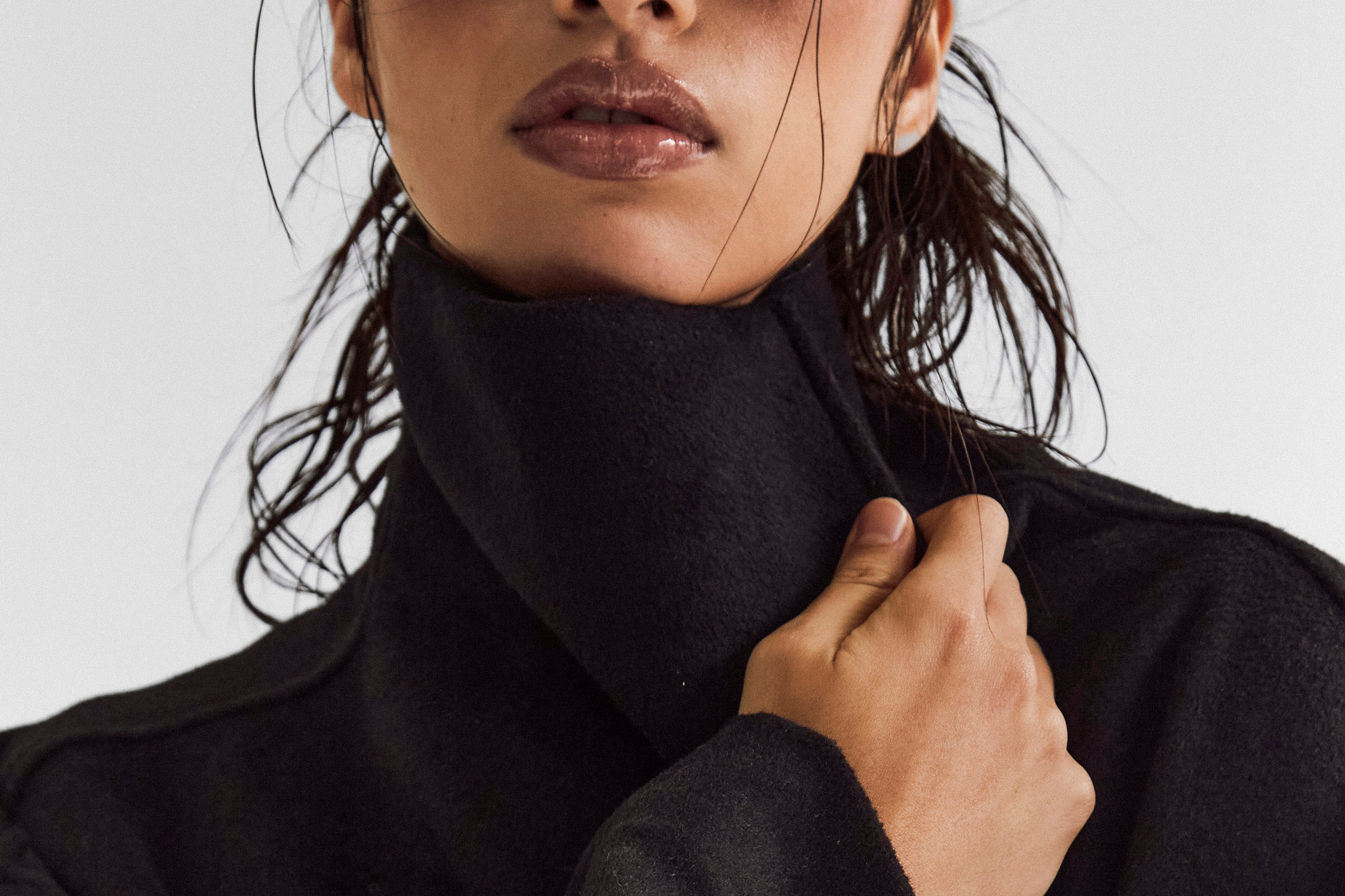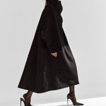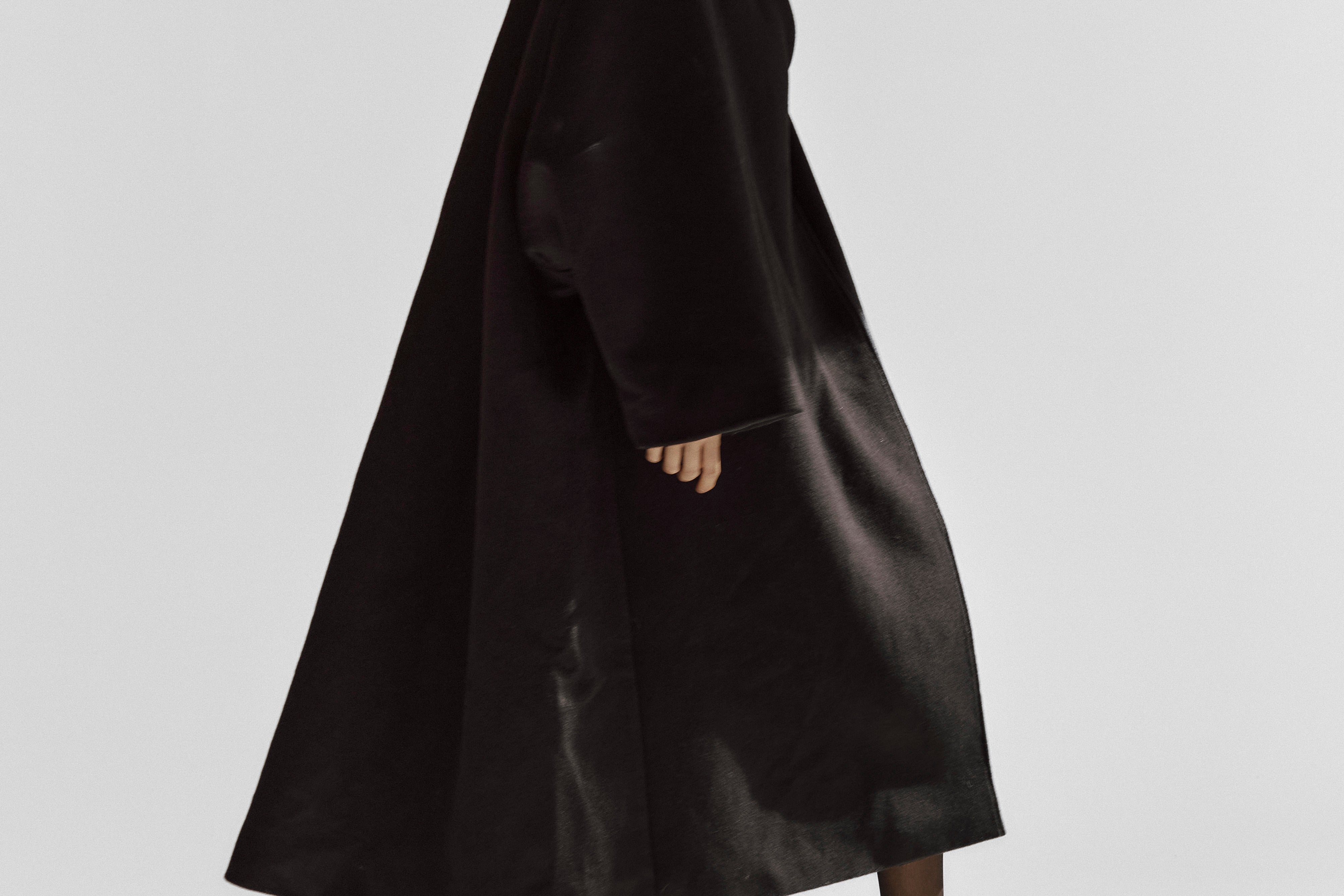 The exaggerated funnel neck creates a sculptural frame around the face, while concealed fastenings and discreet side pockets maintain a seamless shape. In deep black, this coat moves fluidly between day and night making it an understated statement for our favourite season ahead.