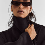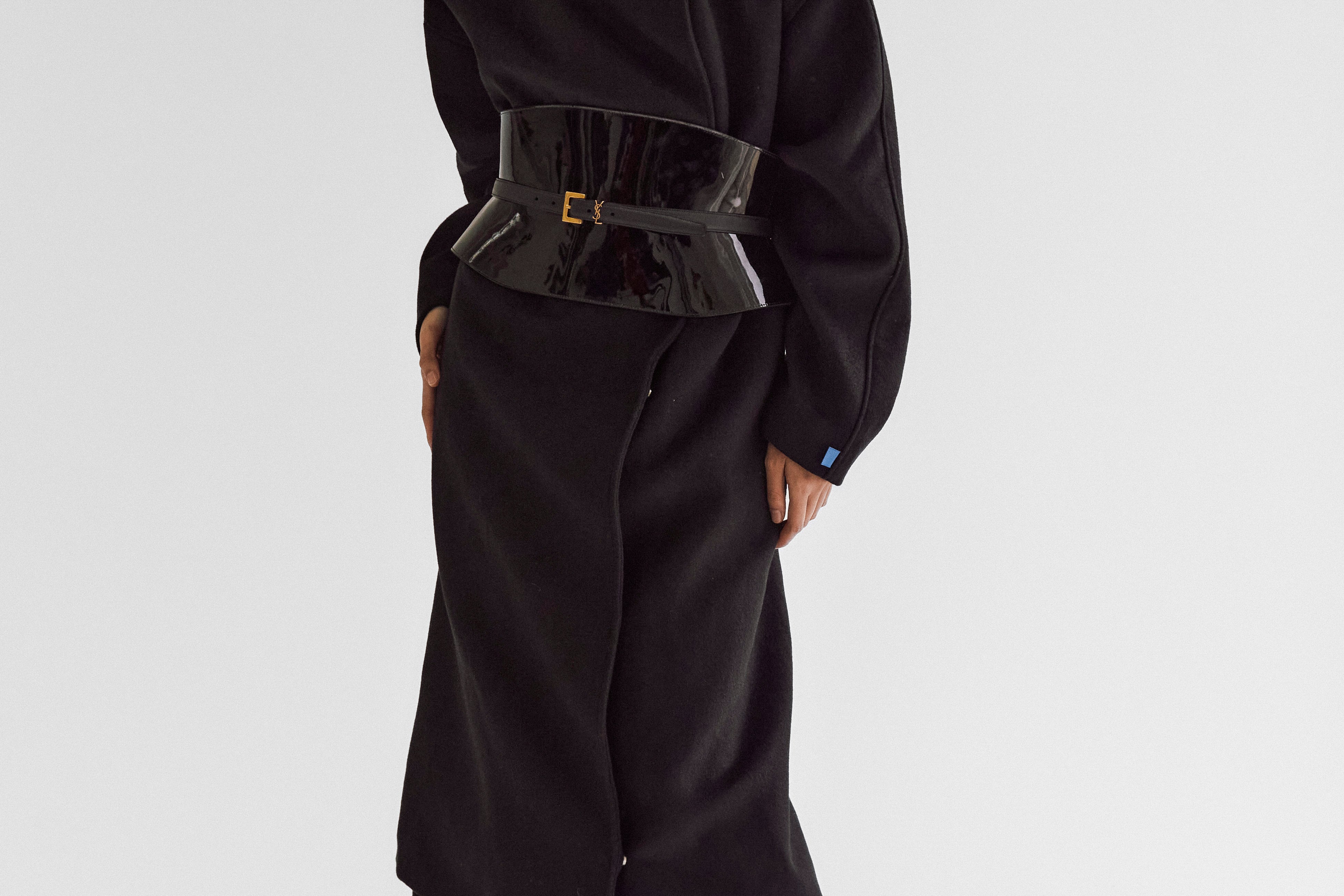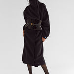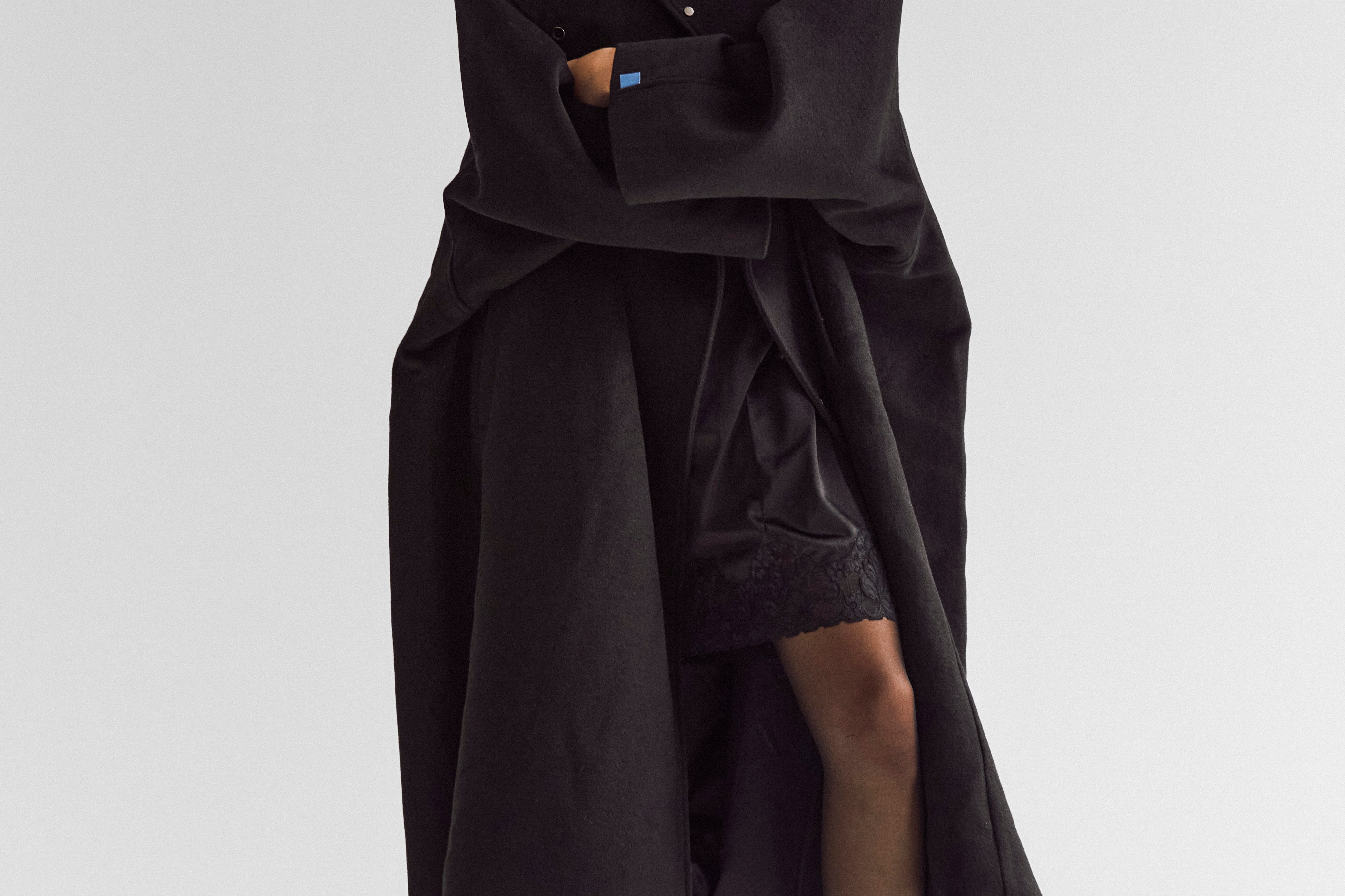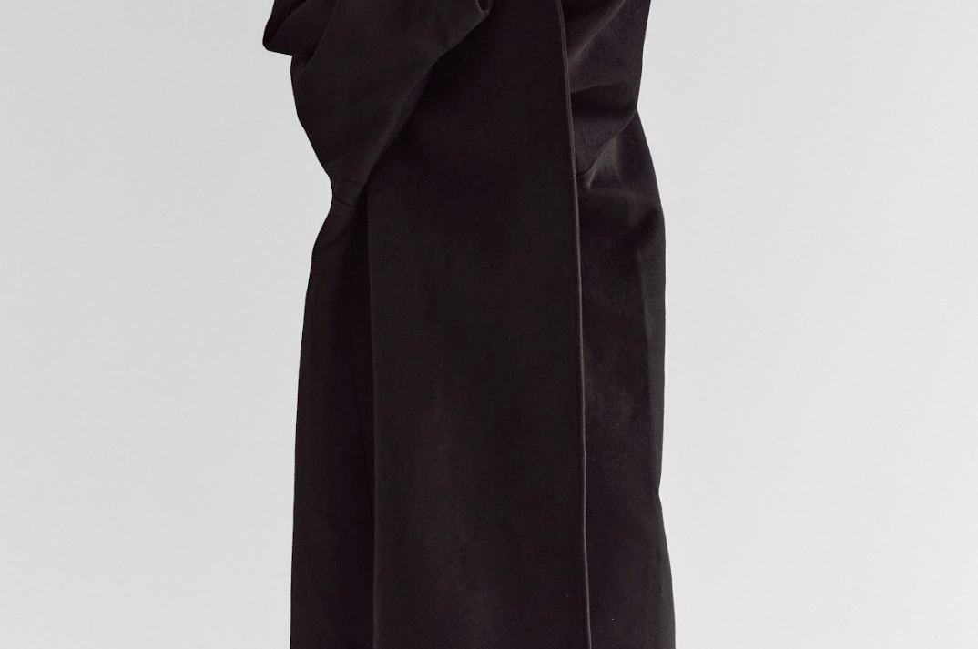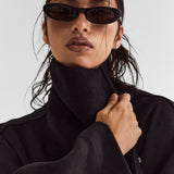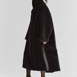 The exaggerated funnel neck creates a sculptural frame around the face, while concealed fastenings and discreet side pockets maintain a seamless shape. In deep black, this coat moves fluidly between day and night making it an understated statement for our favourite season ahead.