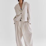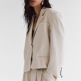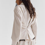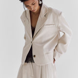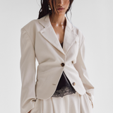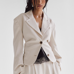 Our structured Boxy Blazer in Ecru brings a contemporary edge to timeless tailoring. Designed with sharp shoulder pads for a bold, sculpted silhouette, it offers a perfect balance between structured formality and understated elegance.